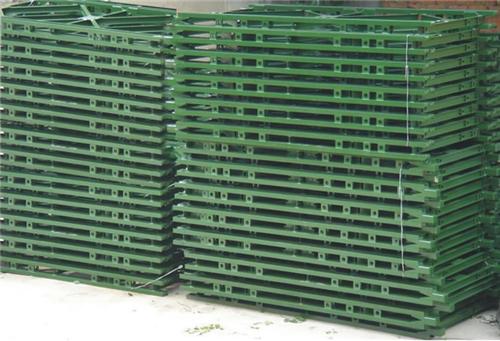 1.横梁﹔横梁上设有4组卡子,用于限定纵粱位置,两端焊有短柱用于连接斜撑,两端底面各有3个凹眼。安装横梁时,将凹眼套入析架下弦杆横梁垫板上的栓钉,使横梁在析架上就位。凹眼的间距与析架间距相同,横梁就位后,析架的间距也就相对固定了。